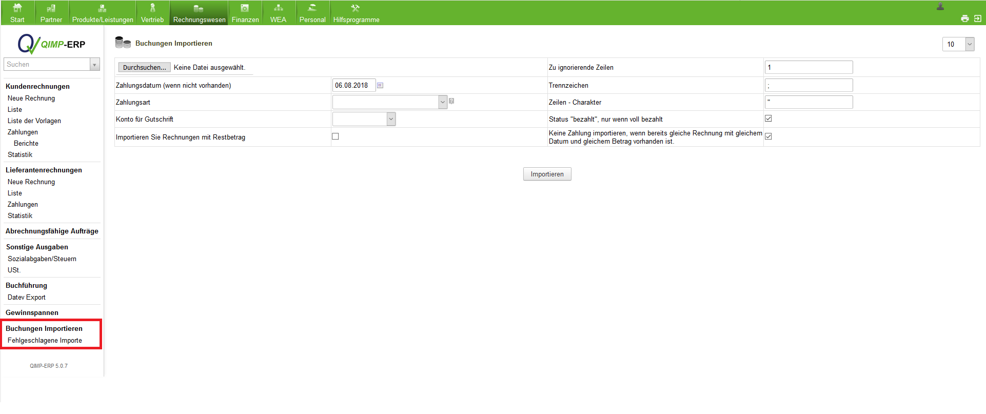 - Keine Zahlung importieren, wenn bereits gleiche Rechnung mit gleichem Datum und gleichem Betrag vorhanden ist. ⇒ verhindert das doppelte Importieren von Zahlungen im QIMP-ERP