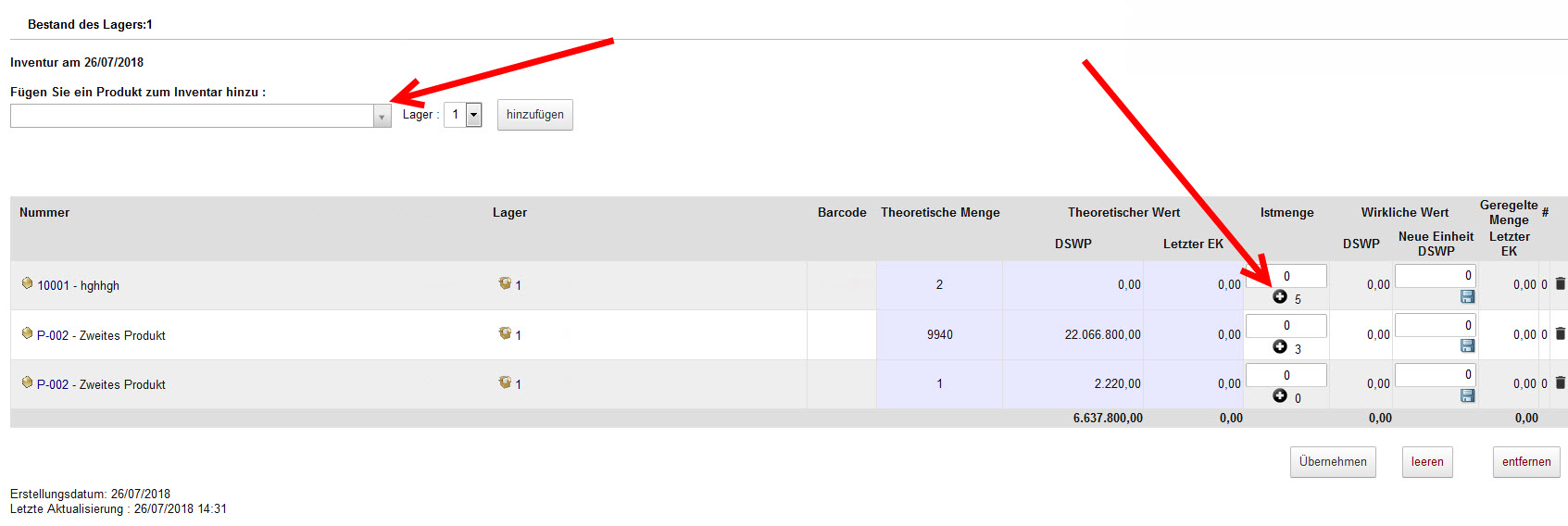 Wenn alle Werte zur Inventur aufgenommen wurden, kann dies mit „Übernehmen“ gespeichert werden. Nach dem Übernehmen der Daten können folgende Funktionen ausgeführt werden.