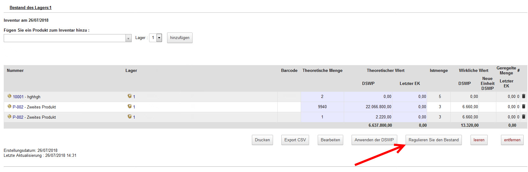 - Die erfassten Bestände in dem Ausgewählten Warenlager Anpassen/Regulieren