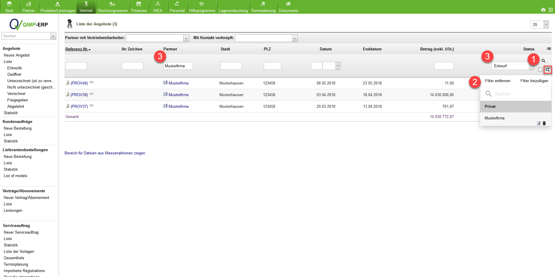 . Z. B. den Partner „Musterfirma“ und den Status „Entwurf“