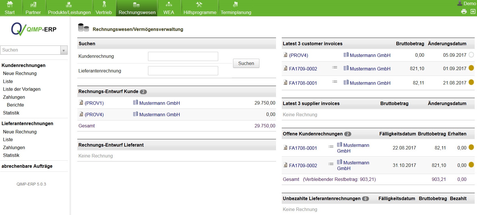 Der Funktionsbereich Rechungswesen beinhaltet die Module Kundenrechnung und Lieferantenrechnung. Über verschiedene Kategorien erhält der Benutzer einen schnellen Überblick über den Verlauf und den Status der Rechnungen.