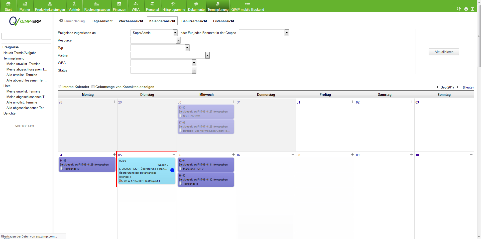Der Funktionsbereich Terminplanung stellt einen Kalender als Übersicht dar. In diesen sind Maßnahmen eingetragen. Maßnahmen stellen automatische generierte Aktionen, Aufgaben und Erinnerungen dar. Somit kann Tagesgenau nachvollzogen werden, welche Maßnahmen etc. bearbeitet bzw. getätigt wurden. Auch zukünftige Maßnahmen könnten erstellt werden.